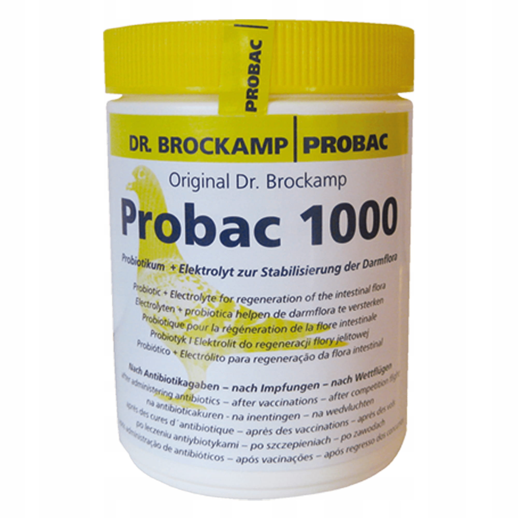 BROCKAMP Probac 1000 - 500g Probac 1000 Elektrolit i probiotyk do regeneracji flory jelitowej: - po leczeniu antybiotykami, - po szczepieniu, - jako elektrolit po zawodach, - po wystawach. Probac 1000 zawiera specjalne połączenie różnych specyficznych mikroorganizmów w postaci mikrokapsułek, jak również jedyne w swoim rodzaju połączenie węglowodanów regulujących florę jelitową. Różne kultury bakteryjne wspierają wzajemną zdolność aktywnej kolonizacji jelita cienkiego gołębia. W ten sposób ułatwiają one procesy trawienia, wytwarzają podstawowe substancje odżywcze, stabilizują florę bakteryjną i wzmacniają układ immologiczny. Ze względu na specyficzny skład Probac 1000 jest idealnym elektrolitem po zawodach. Faza regeneracji znacznie się skraca. Odchody już nastepnego dnia są mocno związane, brązowe i rozpoczyna się regeneracja pierza. Szkodliwe bakterie zostają wyparte szybko i w naturalny sposób z błon śluzowych i kosmek jelitowych i nie mogą się osiedlić. Zalecane dozowanie: 5g Probac 1000 na 1L wody lub 1 kg karmy dla 25 gołębi/dzień; 2 razy w tygodniu.