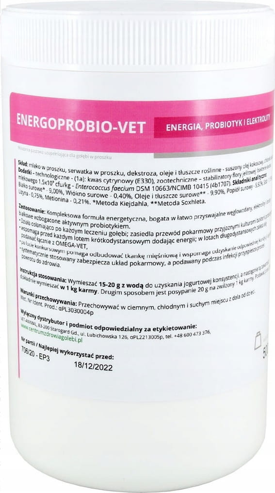 EnergoProbio-Vet Vet Animal Opakowanie: 500g ENERGIA, PROBIOTYK I ELEKTROLIT W JEDNYM Mieszanka paszowa uzupełniająca w proszku dla gołębi. Składniki analityczne Białko surowe* – 9,30%, Włókno surowe – 0,40%, Oleje i tłuszcze surowe** – 9,50%, Popiół surowy – 6,00%, Sód – 1,15%, Potas – 0,50%, Chlorki – 1,80%, Lizyna – 0,0075%, Metionina – 0,0022%. *Metoda Kjeldahla, **Metoda Soxhleta Zastosowanie Kompleksowa formuła energetyczna, bogata w łatwo przyswajalne węglowodany, elektrolity i izolaty białkowe wzbogacone aktywnym probiotykiem: działa osłaniająco po każdym leczeniu gołębi; zasiedla przewód pokarmowy przyjaznymi kulturami bakterii probiotycznych, wspomaga przed każdym lotem krótkodystansowym dodając energii; w lotach długodystansowych zaleca się podawać łącznie z OMEGA-VET, po locie konkursowym pomaga odbudowaæ tkankę mięśniową i wspomaga odzyskanie odpowiedniej kondycji organizmu, systematycznie stosowany wspiera układ pokarmowy, a podawany podczas infekcji przyspiesza proces powrotu do zdrowia. Skład mleko w proszku, serwatka w proszku, laktoza, cukier gronowy, chlorek sodu. Dodatki technologiczne: Kwas mlekowy (E270); zootechniczne – stabilizatory flory jelitowej: bakterie kwasu mlekowego 1,5 x 10 cfu/kg – Enterococcus faecium DSM 10663/NCIMB10415 (E1707). Instrukcja stosowania Wymieszać 15-20 g z wodą do uzyskania jogurtowej konsystencji, a następnie tą zawartość dokładnie wymieszać z 1 kg karmy. Drugim sposobem jest posypanie 20g na zwilżony 1 kg karmy. Podawać przez 2 dni. W razie potrzeby zalecaną dawkę produktu można podwoić i podawać w odstępach 2 dniowych.