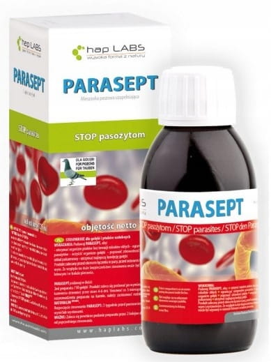 PARASEPT to specjalnie dobrana kompozycja wzajemnie uzupełniających się skoncentrowanych wyciągów ziołowych o silnych właściwościach przeciw pasożytniczych chroniąca gołębie przed ryzykiem zachorowania i spadków odporności wynikających z zarobaczenia. Skład produktu został oparty na precyzyjnie dobranych i wysoko stężonych ekstraktach roślinnych o naukowo potwierdzonej skuteczności, co gwarantuje szerokie spektrum działania i przekłada się na bardzo wysoką skuteczność. Preparat wykazuje działanie wobec glist, kapilarii, tasiemców. W odróżnieniu od chemioterapeutyków naturalne substancje czynne preparatu zapewniają wsparcie odporności oraz oczyszczenie organizmu z toksyn nie wywołując skutków ubocznych. PARASEPT to również skuteczny produkt chroniący organizm gołębi przed wtórnym zatruciem pasożytami, a także likwidujący bakterie i grzyby bytujące w przewodzie pokarmowym. WSKAZANIA: Podawaj PARASEPT, aby: - utrzymać organizm ptaków bez inwazji robaków obłych - ograniczyć występowanie pasożytów - oczyścić organizm gołębi - poprawić zdrowotność ptaków - wesprzeć układ pokarmowy - utrzymać najlepszą kondycję gołębi Produkt zalecany przed okresem łączenia w pary, przed sezonem lotowym i wystawowym. Ze względu na duże bezpieczeństwo stosowania może być używany w sezonie lotowym i w trakcie pierzenia. PARASEPT podawaj w ilości: 2ml preparatu / 50 gołębi Produkt zaleca się podawać po wymieszaniu z karmą (dwa karmienia dziennie) przez okres 4-6 dni. Stosować co 3 miesiące. Celem ułatwienia rozprowadzenia preparatu na karmie, należy zastosować nośnik w postaci 15 ml NATURALIN strong. Rozpoczęcie stosowania PARASEPT: 3 tygodnie przed parowaniem, lotami treningowymi lub wystawami. WAŻNE: Zaleca się powtórne podanie preparatu przez 2 kolejne dni po 10-14 dniach od poprzedniego stosowania.
