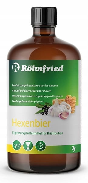 Röhnfried HEXENBIER 500ml • Wzrost formy • Odporność • Pierzenie puchu Hexenbier jest mieszanką witalną złożoną z cebuli, miodu, propolisu, jeżówki, soku z czarnego bzu, brodaczki (Usnea barbata) i czosnku, wzmacniającą siły odpornościowe organizmu i wzbudzającą w gołębiach chęć latania. Gołębie, które przez wiele dni dostają Hexenbier mają ładnie różowe mięśnie piersiowe, intensywnie pierzą puch i mają białe brodawki nosowe.