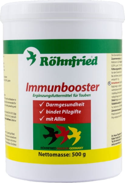 ROHNFRIED Immunbooster 500g Suplement diety dla gołębi. Poprawia szybkość reakcji układu odpornościowego naszych podopiecznych i tym samym ich zdrowie. Zawiera również funkcjonalne pierwiastki śladowe, takie jak siarka i cynk oraz inowacyjną substancję wiążącą mykotoksyny grzybowe. Podobnie jak Jungdierpulver także w Immunbooster zawarte są probiotyki, alliina oraz kolostrum białka wspierające odporność gołębi w fazie stresu. Skład: drożdże i ich części 40%, węglan wapnia, węgiel roślinny 8%, czerwone wapienne algi 2,5%, włókno pszenne 2,5%, siara 0,2% Stosowanie: 10g na 20 gołębi dziennie Przed stresem (wystawy, pierwsze treningi) przez 3-5 dni Przed lotem konkursowym: przez 3 dni Lęgi: 2 razy w tygodniu Pierzenie: 2 razy w tygodniu Loty młodych: 4 razy w tygodniu Przy biegunce lub chorobie młodych: codziennie Przed szczepieniem: przez 7 dni przed szczepieniem 1 czubata miarka to 10g