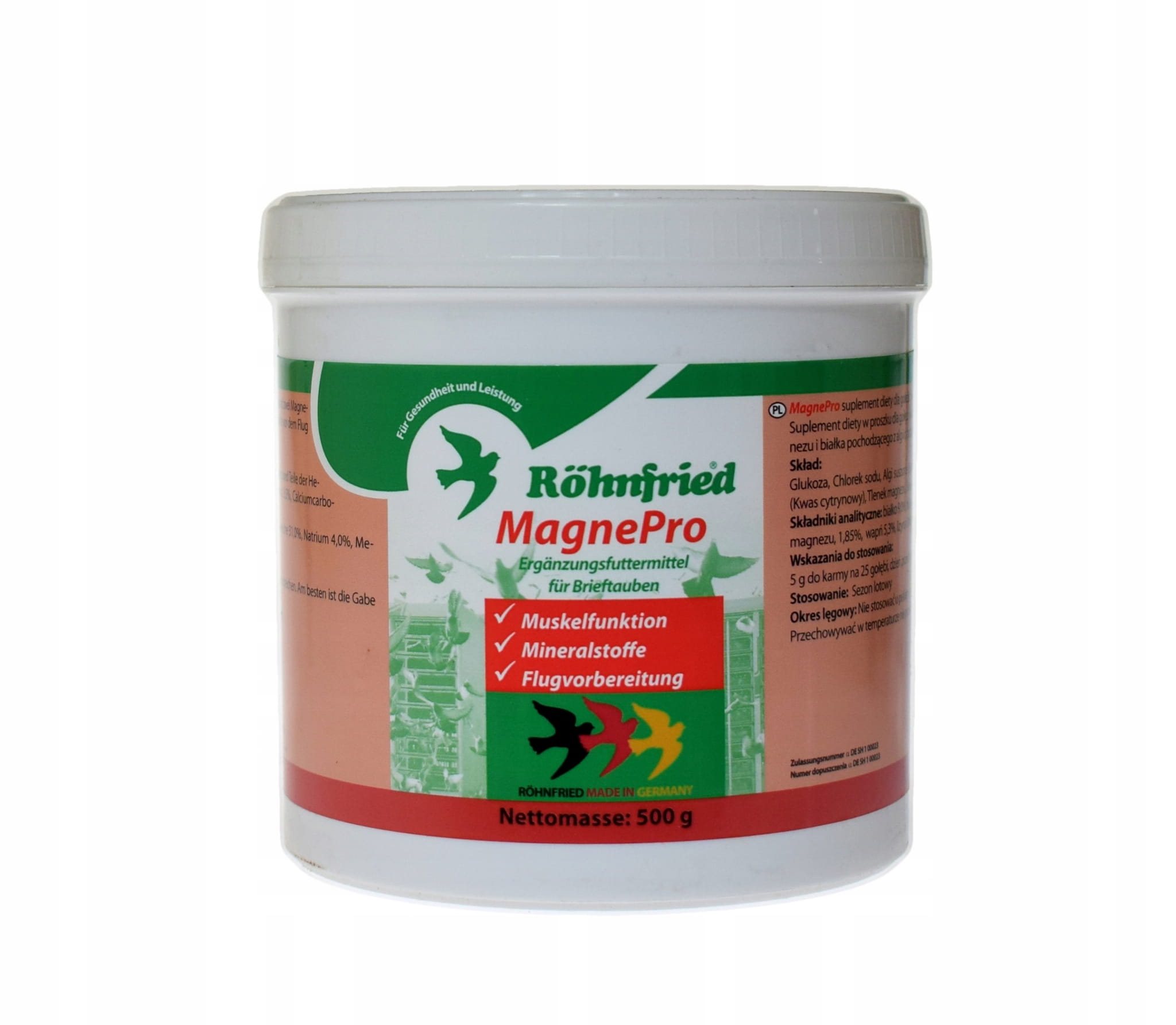 Rohnfried - MagnePro - 500g (skurcze mięśni) OPIS: Jeśli zaczynasz intensywne treningi Boisz się zerwania mięśni Chcesz wspomóc pracę szkieletu mięśniowego Chcesz zapobiec mikrouszkodzeniom mięśni Rohnfried MagnePro jest dla Ciebie! Magnez i białko połączone w jednym produkcie. MagnePro to produkt dla gołębi w proszku dla gołębi, na bazie składników mineralnych, takich jak wapń i sód oraz dwóch źródeł magnezu i białka pochodzącego z alg i drożdży. MagnePro powinno się podawać przed lotem, by zapobiec skurczom mięśni. Stosowanie: 5 g do karmy na 25 gołębi, dzień przed lotem. Najlepiej podawać z Oregano-Schaffett i RO 200 ready. Przechowywanie: Przechowywać szczelnie zamknięte w temperaturze nie wyższej niż +25°C.